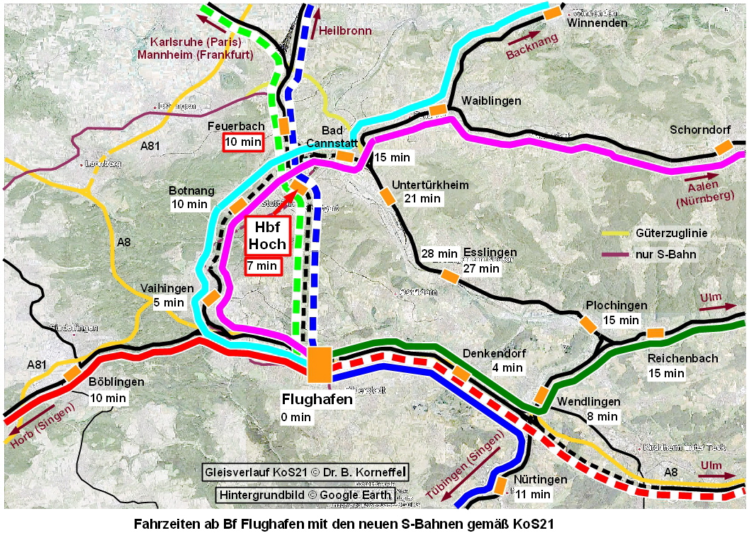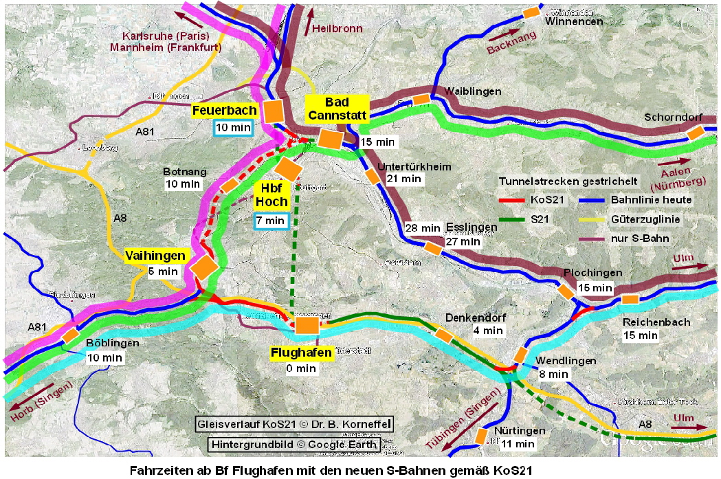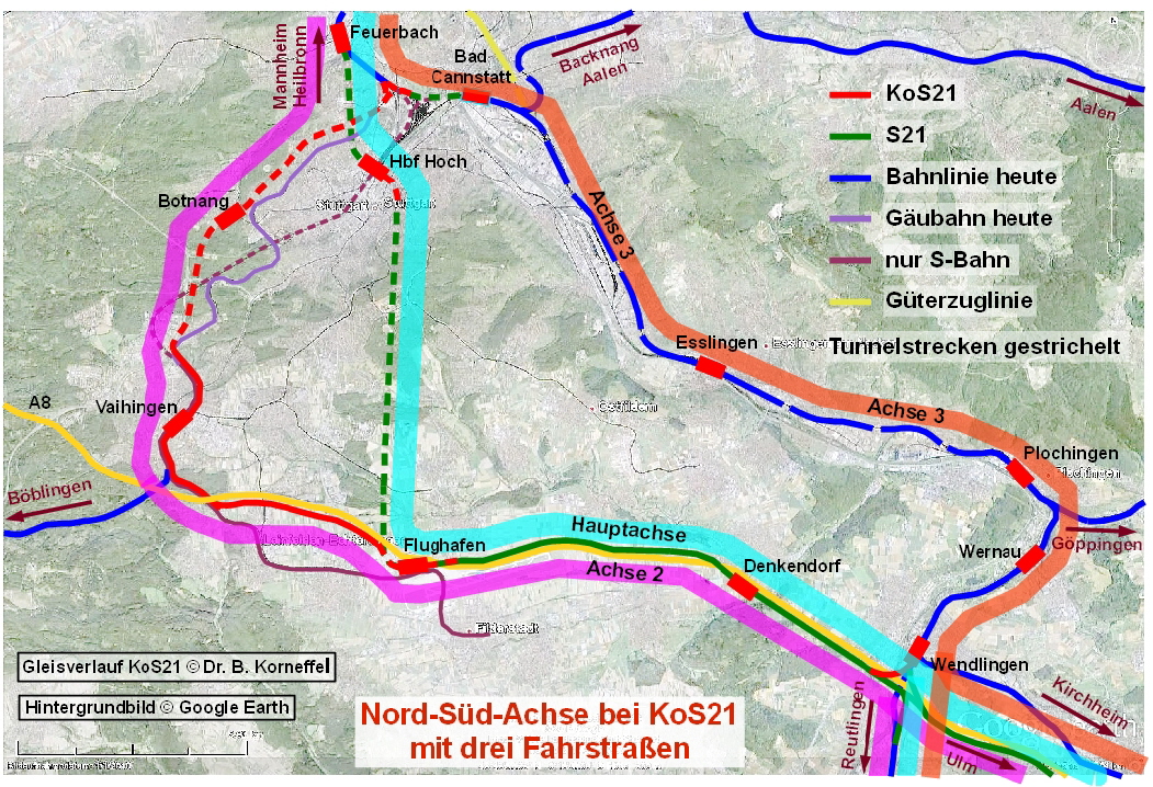 Dr. Burghard Korneffel Fahrstraßen für den Fern- und Regionalverkehr Nord-Süd-Achse bei KoS21 Der Fernverkehr auf der Magistrale büßt bei KoS21 keine einzige Sekunde an Fahrzeit ein und lässt sich auf der Nord-Süd-Achse äußerst stabil betreiben, da neben dem Hauptweg durch den Nord- und Südtunnel zwei weitere Fahrstraßen auf den Achsen 2 und 3 vorhanden sind. Es gibt nur einen DB-Bahnhof am Flughafen, in dem sämtliche Züge halten.