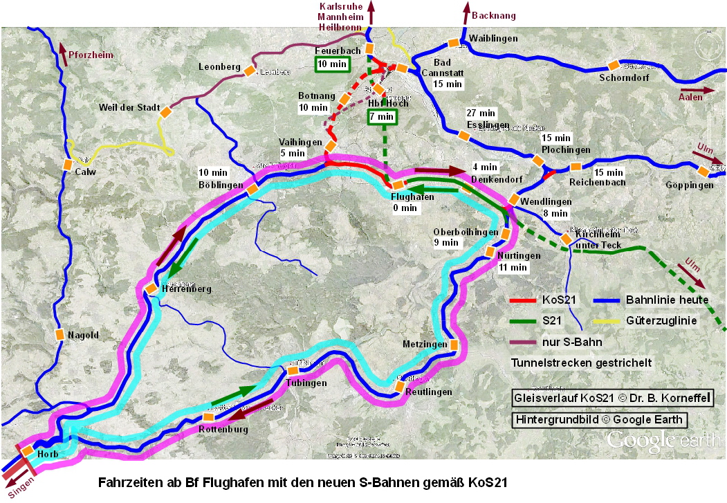 Bild 13. Schönbuchschleife (mit Optionen Rohrer Kurve und Wernauer Kurve) Schönbuchschleife In letzter Zeit wurde heftig (zum Beispiel beim „Filderdialog“) die Einbindung der aus Westen kommenden Linien in das Gleisnetz von S21 diskutiert. Linienführung über Tübingen oder Böblingen? Beim Filderdialog wurde zugunsten Böblingens votiert, und das Lager „Tübingen“ grollte. Die „Schönbuch-Schleife“ von KoS21 (Bild 13) würde die Wünsche beider Lager erfüllen. Der Personenverkehr auf der Schiene bekäme in dem „Schleifengebiet“ einen ordentlichen Zuwachs. Die Fernzüge aus Richtung Singen teilen sich in Horb in zwei Züge. Zug A befährt die „Schönbuchschleife“ im Uhrzeigersinn: Horb – Böblingen – Gleisdreieck Rohr – Flughafen – Wendlinger Kreuz – Tübingen – Horb. Zug B befährt die „Schönbuchschleife“ entgegen dem Uhrzeigersinn: Tübingen – Wendlinger Kreuz – Flughafen – Gleisdreieck Rohr – Böblingen – Horb. Beide Züge werden nach Durchfahren der Schleife in Horb wieder zusammengekoppelt und fahren zurück nach Singen. Zug A erreicht als erster den Flughafen, denn die Strecke über Herrenberg und Böblingen ist schneller. Nach kurzem Halt fährt er weiter in Richtung Tübingen und erreicht wieder Horb. Zug B erreicht den Flughafen später, denn die Stecke über Tübingen ist langsamer. Nach kurzem Halt fährt er weiter in Richtung Böblingen und erreicht wieder Horb. In Horb kommen beide Züge gleichzeitig nach Durchfahren der Schönbuchschleife an, denn jeder hat die exakt gleiche Streckenlänge absolviert. Zeitgewinn mit KoS21 beim Fernverkehr auf der Magistrale Bei KoS21 halten sämtliche Züge im Hbf und im Bf Flughafen. Bei S21 fahren die meisten der schnellen Züge am Bf Flughafen außen vorbei. Nur wenige ausgewählte, vornehmlich die langsamen, halten nach aufwendigem Ausfädeln im Bf Flughafen. Damit wird der Bf Flughafen zu einer Farce. Mit riesigem Aufwand als Fernbahnhof gebaut, aber die begehrten Fernzüge halten nicht! Für die Bürger im Süden des Großraums Stuttgart wie auch für den Flughafen selbst hat er damit keinen Wert. Wieso die Flughafenbetreiber für den Bau dieser eigenartigen Variante, welche den Flughafen eben nicht verkehrsgerecht an das Gleisnetz anschließt, der Bahn AG einen dreistelligen Millionenbetrag als Zuschuss gaben, erschließt sich auch nach längerem Nachdenken nicht. KoS21 ermöglicht im Fernverkehr tangentiale Linien, zum Beispiel von Norden über Feuerbach direkt nach Böblingen (und weiter) oder direkt nach Bad Cannstatt (und weiter). Damit werden gegenüber S21 massive Zeitgewinne erreicht. Bei S21 fahren alle Züge über das Ringtunnelsystem zum Hbf und danach über selbiges wieder in die gewünschte Zielrichtung. Das kostet Zeit! S21 behauptet, für den Fernverkehr auf der Magistrale maßgeschneidert zu sein und auf dieser bedeutende Verkürzungen in der Fahrzeit zu erreichen. Für den Bürger, der in die Ferne will, beginnt die Reise an seinem S- oder U-Bahnhof. Die Reisezeit von Tür zu Tür, das ist die tatsächliche Zeit treal, entscheidet die Wahl „Auto oder Zug“ und nicht die Lage des Fernbahnhofs. Ein Vergleich von S21 mit KoS21 bezüglich treal ergibt: Beim Reisestart im Zentrum haben KoS21 und S21 die gleichen Fahrzeiten. Beim Reisestart außerhalb des Zentrums erzielt KoS21 deutliche bis massive Zeitgewinne gegenüber S21!